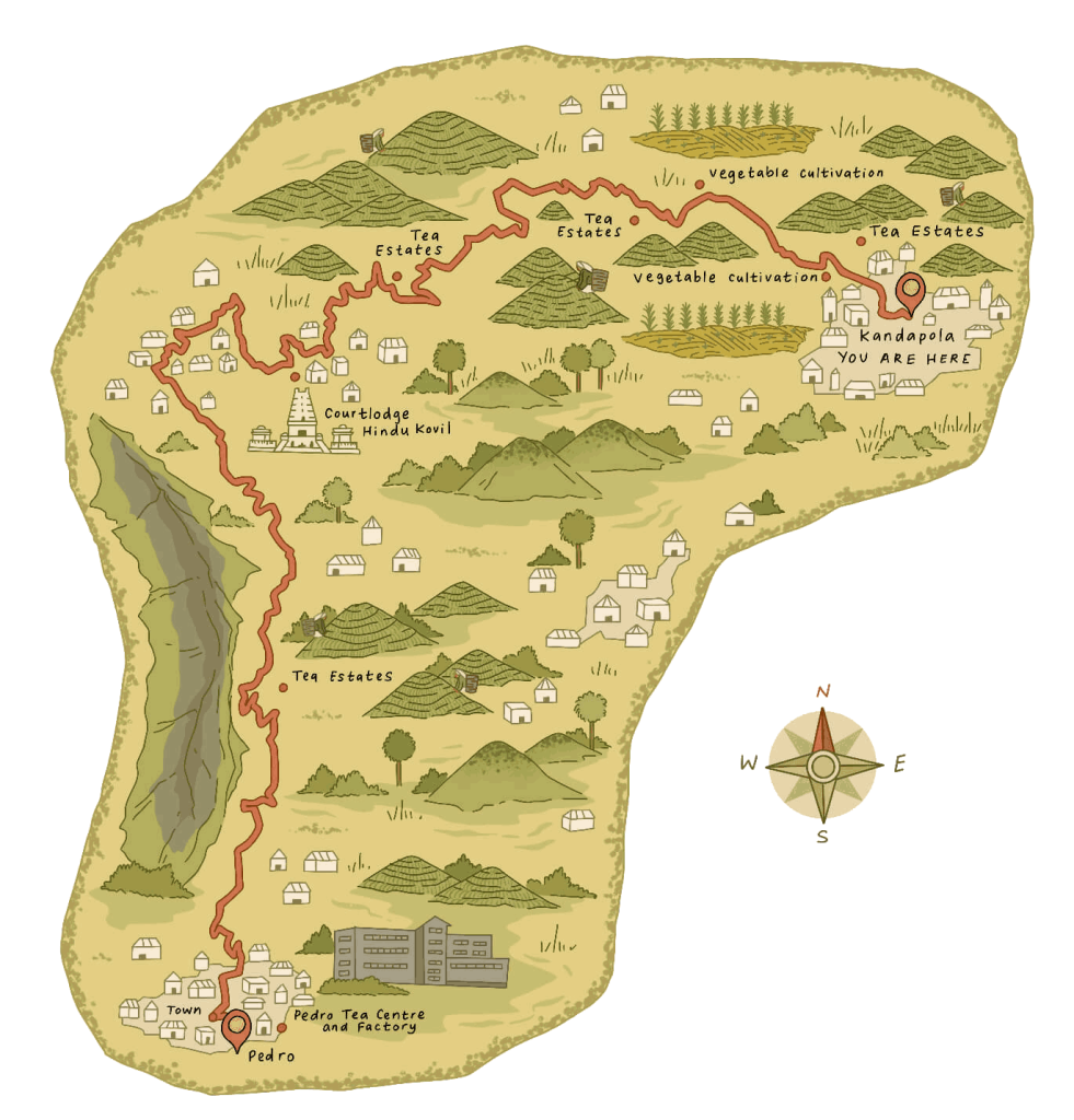 The trail begins in Kandapola, a bustling transit town located 14 km east of the regional capital, Nuwara Eliya. From the town center, take the road directly opposite the petrol station and follow it for approximately 1.6 km. At this point, the trail veers left, just in front of an old warehouse, and leads you out of the village and into the open tea estates.