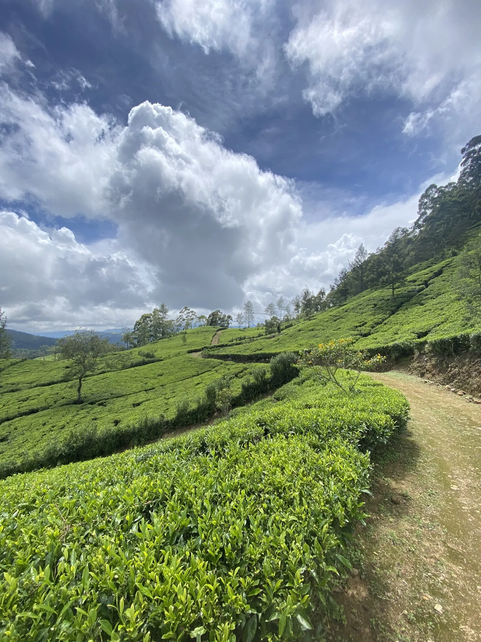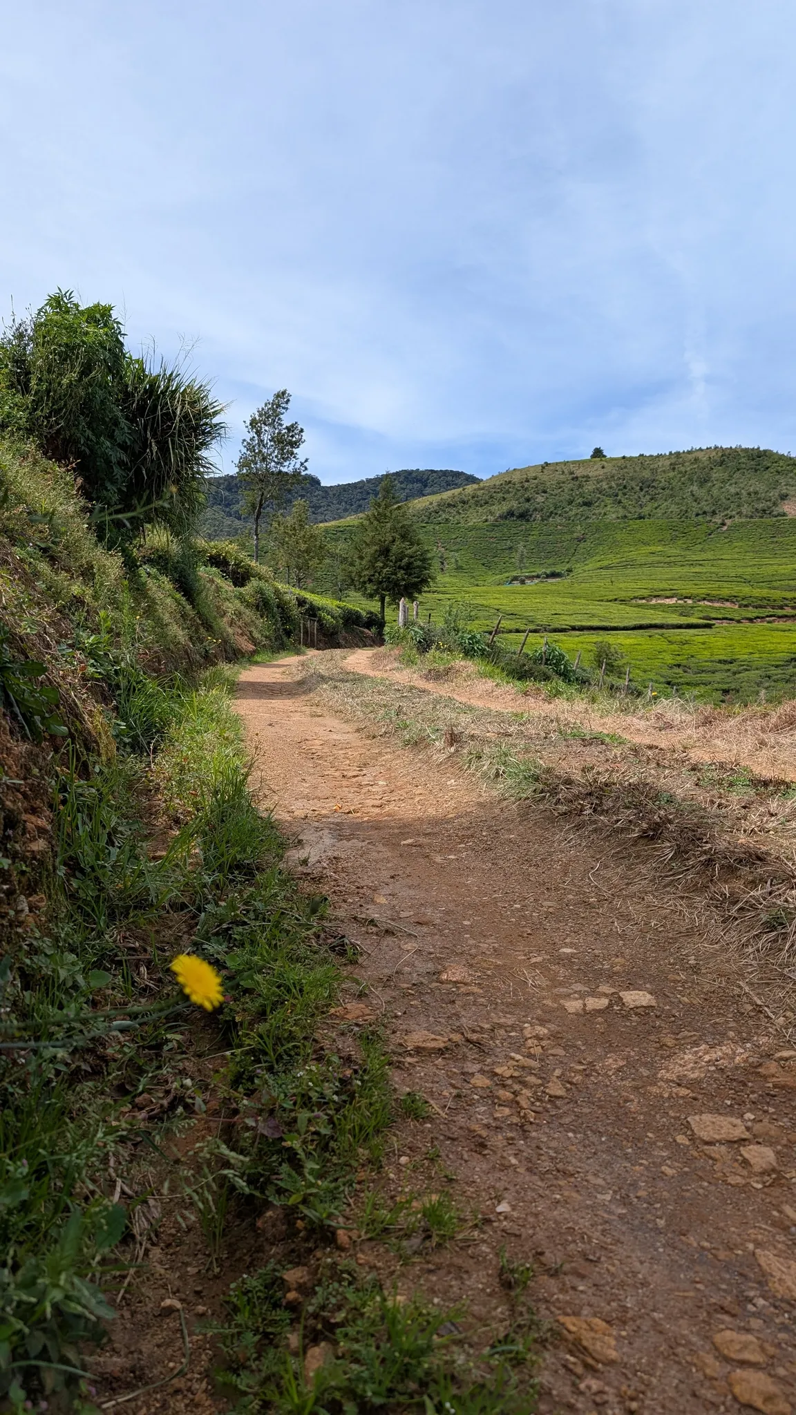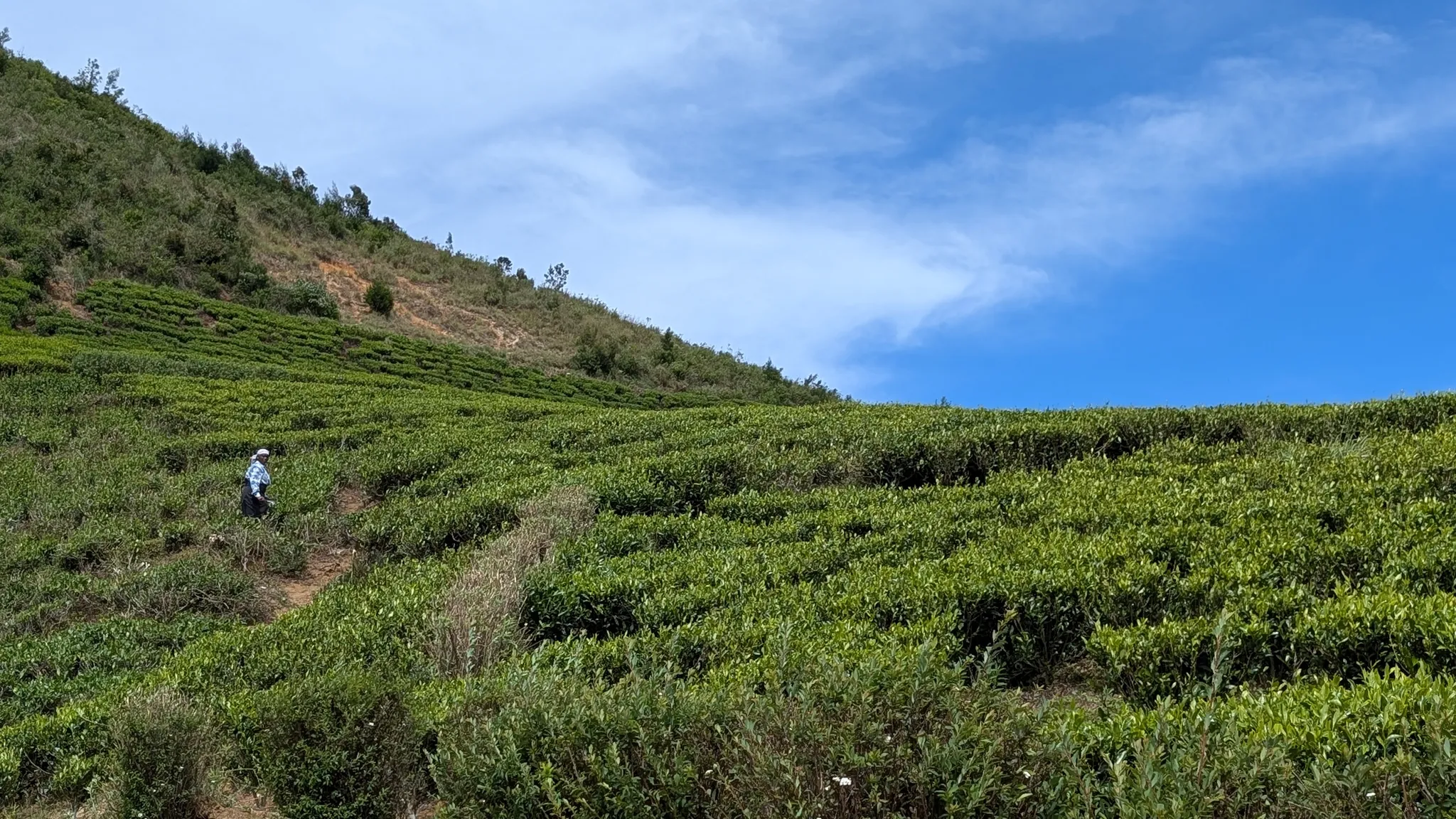 For the next 8 km, the path follows tea estate tracks, offering little shade. Be prepared for sunny conditions with sun protection, or bring a warm layer and raincoat if the weather turns windy or rainy, as temperatures here can drop significantly.