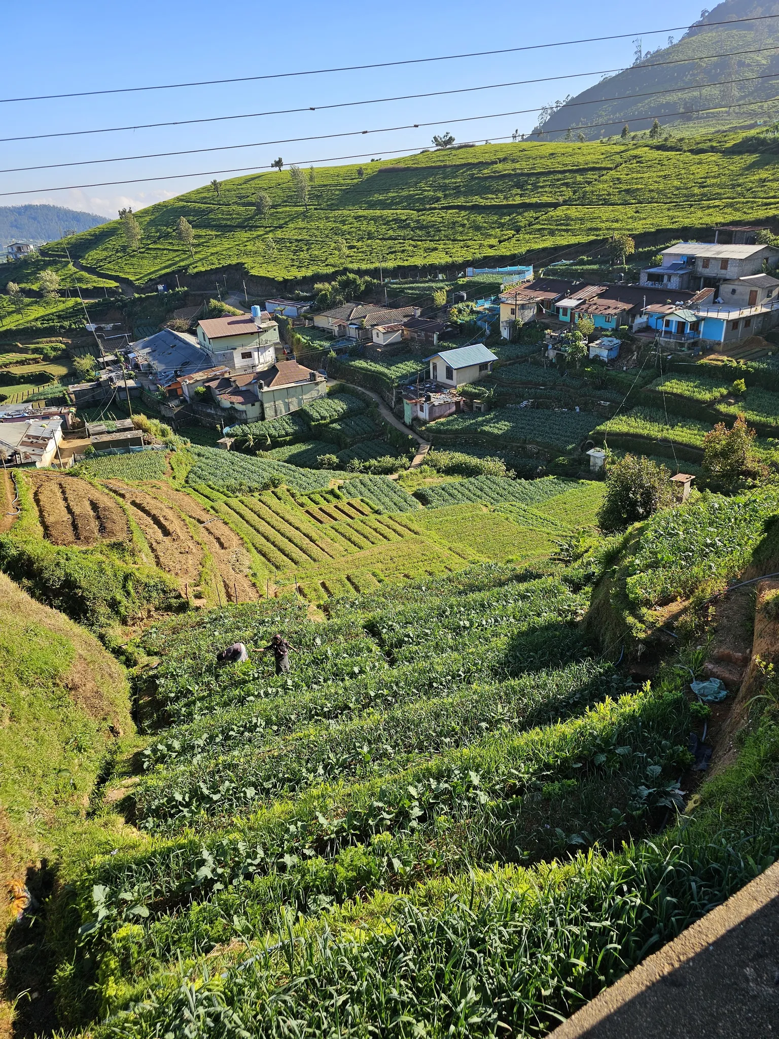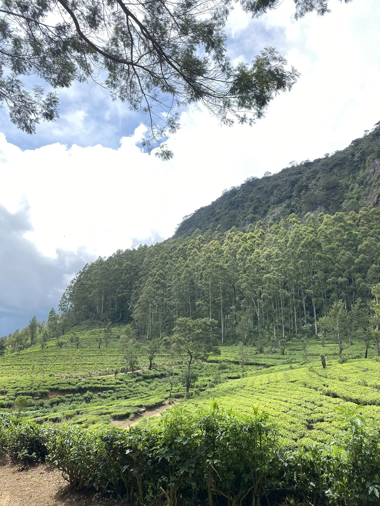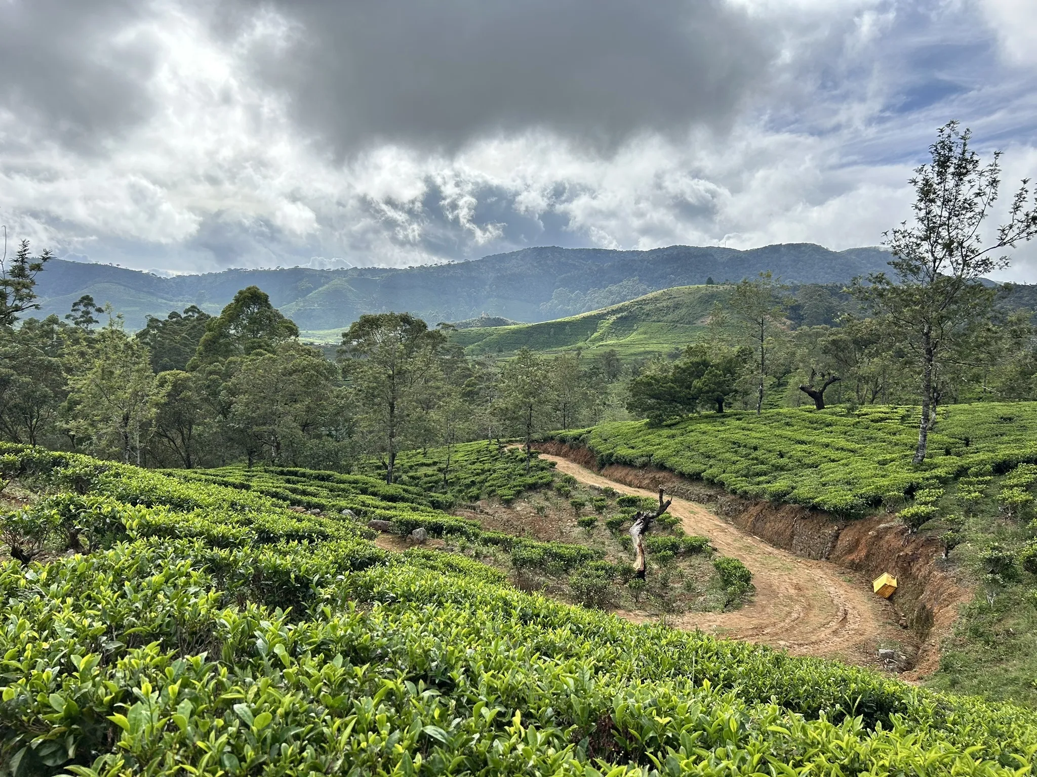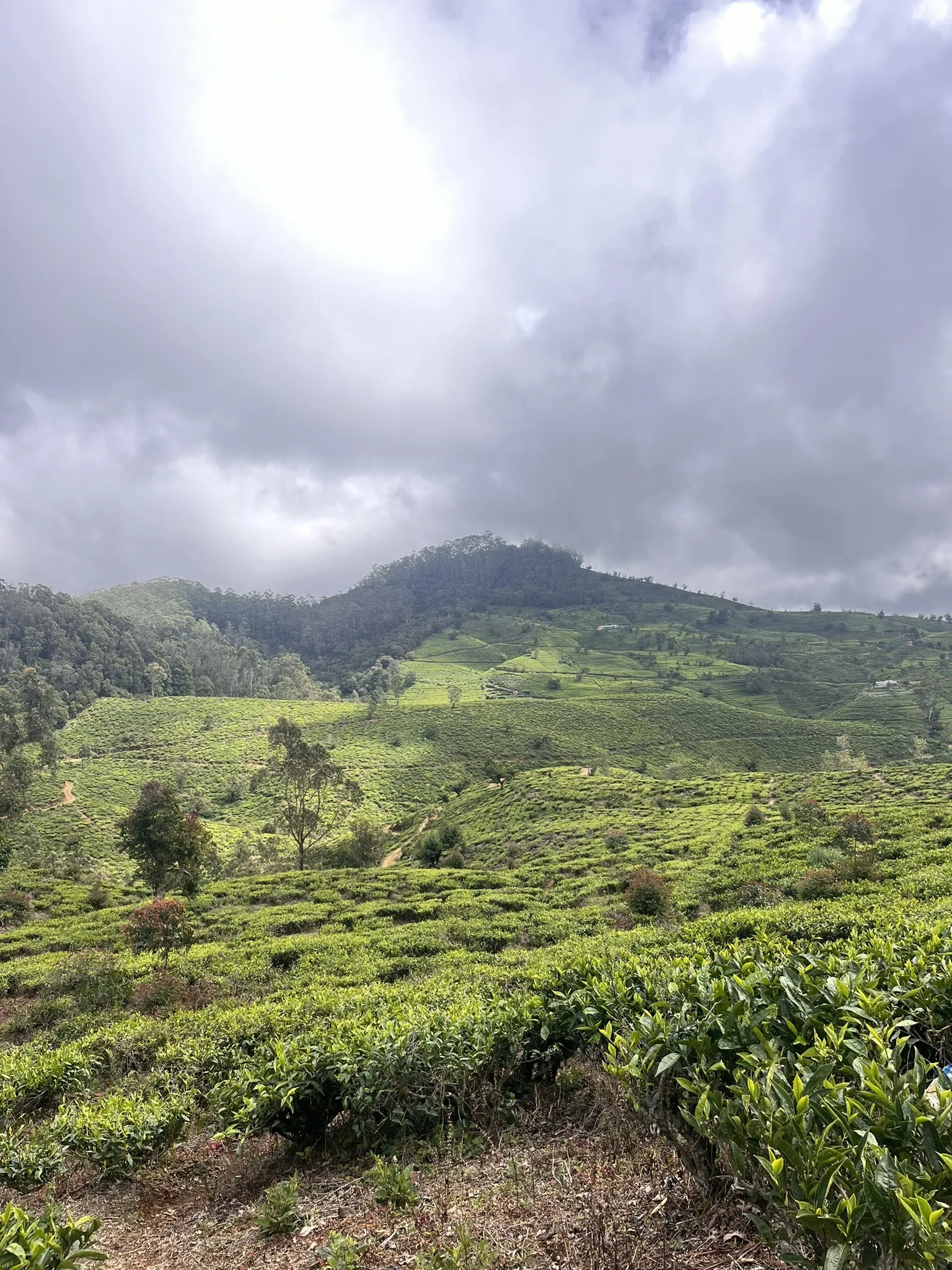 For the next 8 km, the path follows tea estate tracks, offering little shade. Be prepared for sunny conditions with sun protection, or bring a warm layer and raincoat if the weather turns windy or rainy, as temperatures here can drop significantly.