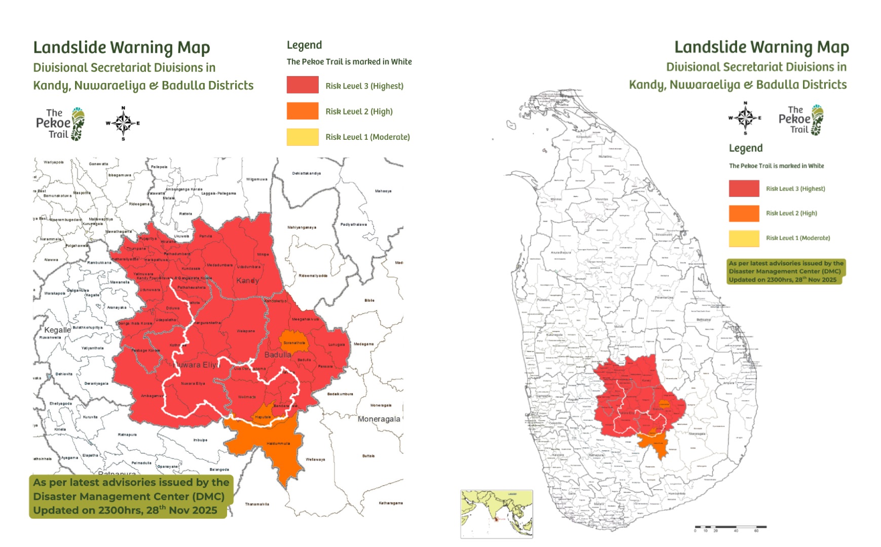 The Pekoe Trail Organization urges all hikers to refrain from using any stage of the Pekoe Trail at this time due to ongoing extreme weather conditions across the Central Highlands. Heavy rainfall, flooding, strong winds and landslide risks have made the trail network unsafe for all forms of hiking and outdoor movement.